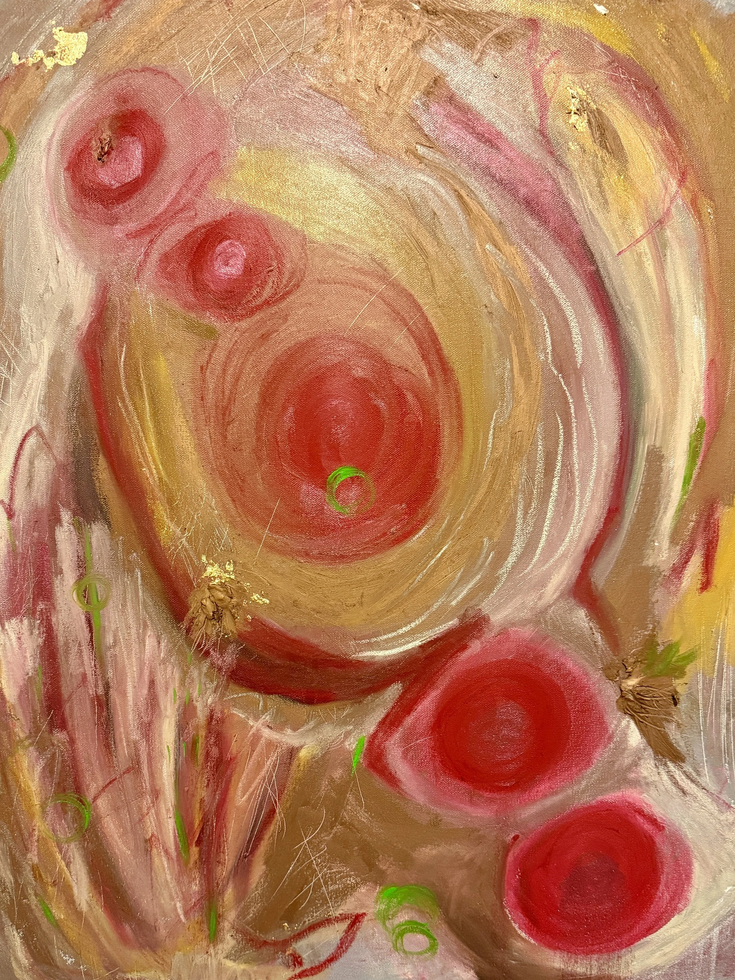 Her intuitive painting process allows her to create without preconceived ideas, resulting in works that reflect her inner world and transformative emotional experiences.